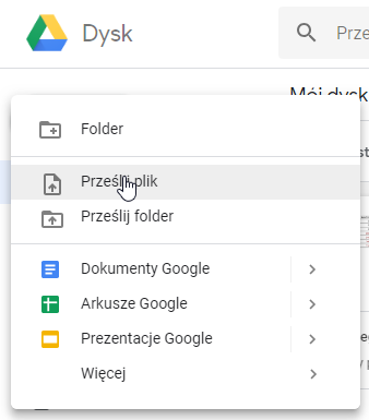 - Na stronie Dysk Google kliknij przycisk „Nowy” w lewej części strony.