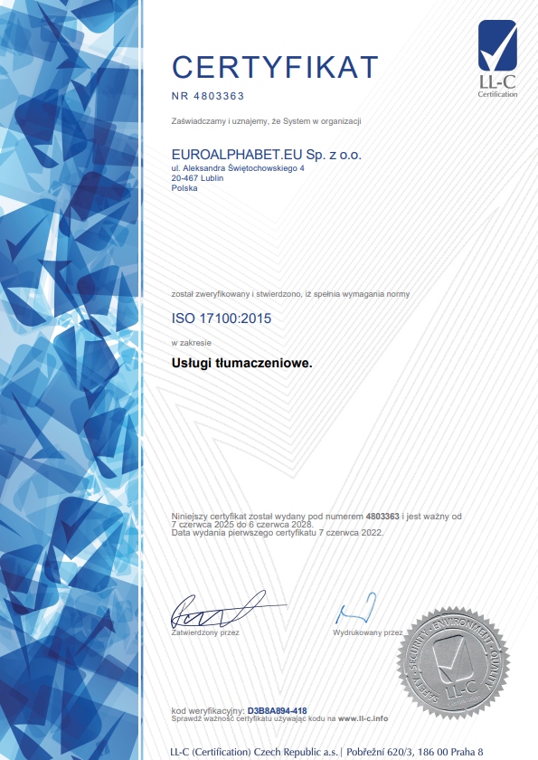W 2025 roku EUROALPHABET.EU sp. z o.o. uzyskała przedłużenie niezależnego certyfikatu zgodności procesu tłumaczeń z normą PN-EN ISO 17100:2015.