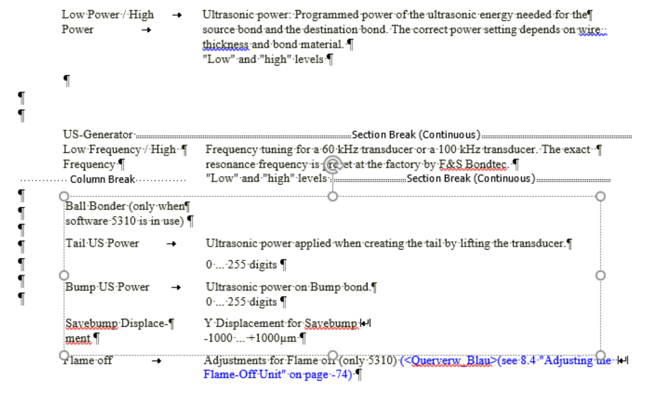 Często opiera się wyrównanie zawartości w komórkach na znacznikach na linijce, co prowadzi do niespójności. Mogą być wyrównane do lewej z postrzępionym marginesem, choć komórki, przykładowo, powinny być wyśrodkowane. Problem staje się widoczny i wymaga ponownej, ręcznej korekty formatowania przy większej ilości tłumaczonego tekstu technicznego.